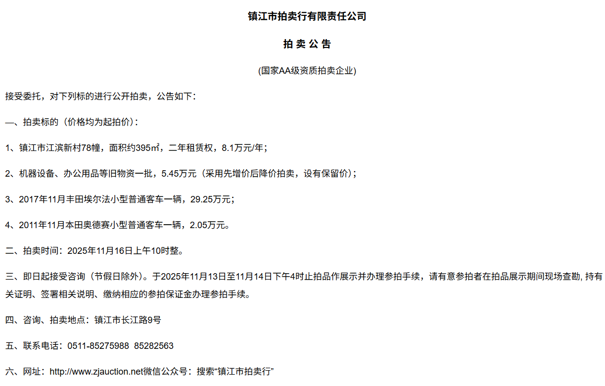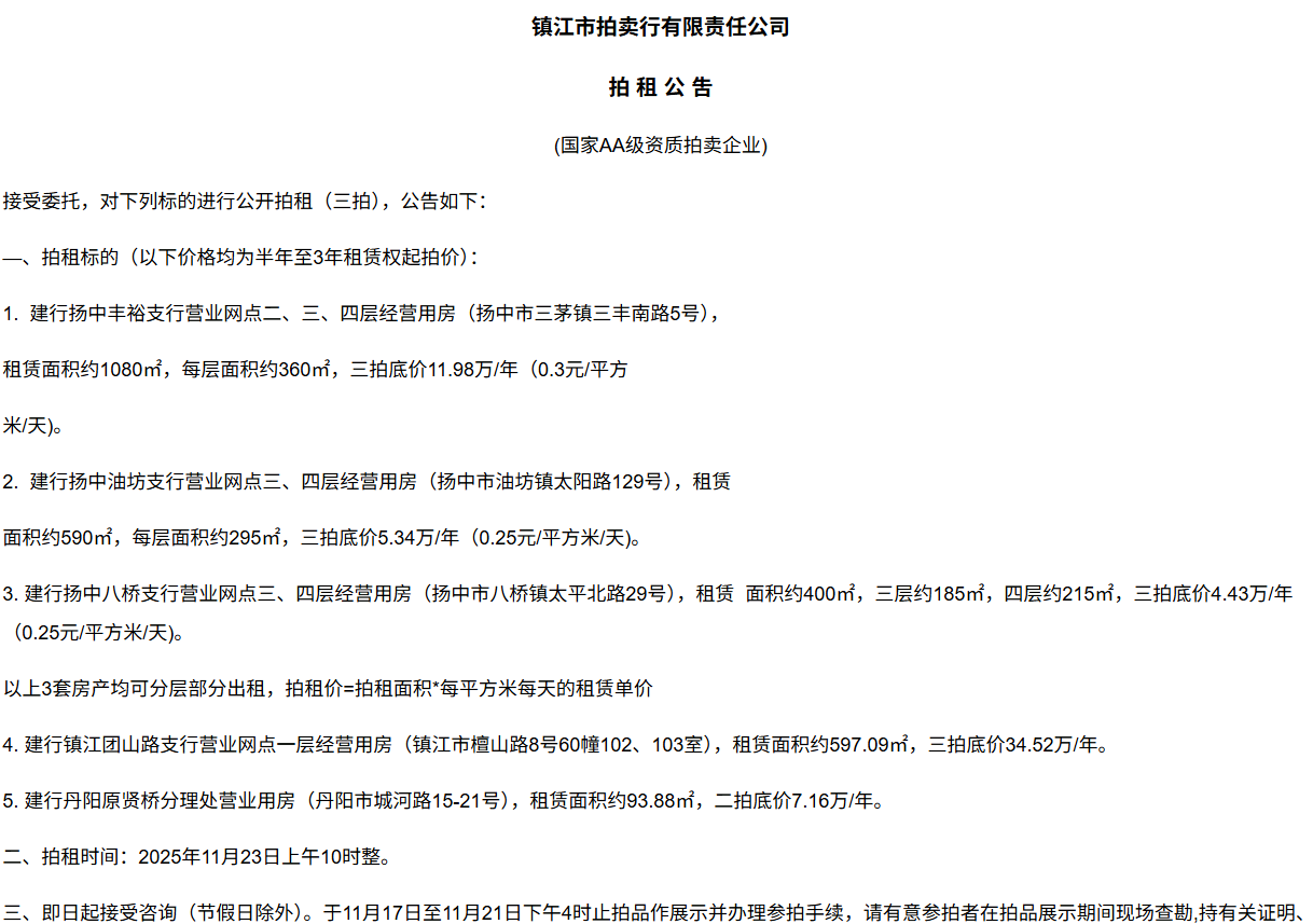 鎮江市拍賣行有限責任公司拍 租 公 吿(國家AA級資質拍賣企業)接受委托,對下列標的進行公開拍租(三拍),公告如下:—、拍租標的(以下價格均為半年至3年租賃權起拍價):1.  建行揚中豐裕支行營業網點二、三、四層經營用房(揚中市三茅鎮三豐南路5號),租賃面積約1080㎡,每層面積約360㎡,三拍底價11.98萬/年(0.3元/平方米/天)。2.  建行揚中油坊支行營業網點三、四層經營用房(揚中市油坊鎮太陽路129號),租賃面積約590㎡,每層面積約295㎡,三拍底價5.34萬/年(0.25元/平方米/天)。3. 建行揚中八橋支行營業網點三、四層經營用房(揚中市八橋鎮太平北路29號),租賃  面積約400㎡,三層約185㎡,四層約215㎡,三拍底價4.43萬/年(0.25元/平方米/天)。以上3套房產均可分層部分出租,拍租價=拍租面積*每平方米每天的租賃單價4. 建行鎮江團山路支行營業網點一層經營用房(鎮江市檀山路8號60幢102、103室),租賃面積約597.09㎡,三拍底價34.52萬/年。5. 建行丹陽原賢橋分理處營業用房(丹陽市城河路15-21號),租賃面積約93.88㎡,二拍底價7.16萬/年。二、拍租時間:2025年11月23日上午10時整。三、即日起接受咨詢(節假日除外)。于11月17日至11月21日下午4時止拍品作展示并辦理參拍手續,請有意參拍者在拍品展示期間現場查勘,持有關證明、簽署相關說明、繳納相應的參拍保證金辦理參拍手續。四、咨詢、拍租地點:鎮江市長江路9號五、聯系方式:0511-85275988   13655299933楊先生六、網址:http://www_zjauction_net.meditationdiary.com;微信公眾號:搜索“鎮江市拍賣行” 拍品清單2025.11.23序號名稱起拍價(元)標的說明1建行揚中豐裕支行營業網點二、三、四層經營用房(揚中市三茅鎮三豐南路5號),租賃面積約1080㎡,每層面積約360㎡三拍底價11.98萬/年(0.3元/平方米/天)1、1-3號房產均可分層部分出租,拍租價=拍租面積*每平方米每天的租賃單價;2、意向競拍人在拍賣前需持營業執照或身份證與委托方說明租賃房產經營業態,確定意向后出具房產承租用途承諾書,經委托方審核后,方可交納保證金參加競拍;3、租賃期限為半年至3年(承租方與出租方協商而定),承租方每半年或一年結付租金,租賃期間的水、電費用及其它相關費用均由承租方承擔;4、承租方不得用于經營和保管危險物品,不得用于開設餐飲、娛樂等可能嚴重影響消防安全、運營安全的經營業態,不得用于經營委托貸款、小額貸款等可能冒用委托方名義,帶來聲譽風險的經營業態。租賃期內,承租方不得破壞墻體結構,自行成就消防、安全等使用條件,不得擅自將租賃房屋轉租、轉讓給他人使用,否則委托方有權收回房屋;5、拍租成交后,承租方將租金交至出租方指定賬戶,傭金交至拍賣方賬戶(拍租傭金為該房屋一個月租金)。承租方憑租賃合同無息退還保證金。2建行揚中油坊支行營業網點三、四層經營用房(揚中市油坊鎮太陽路129號),租賃面積約590㎡,每層面積約295㎡三拍底價5.34萬/年(0.25元/平方米/天)3建行揚中八橋支行營業網點三、四層經營用房(揚中市八橋鎮太平北路29號),租賃面積約490㎡,每層面積約245㎡三拍底價4.43萬/年(0.25元/平方米/天)4建行鎮江團山路支行營業網點一層經營用房(鎮江市檀山路8號60幢102、103室),建筑面積約597.09㎡三拍底價34.52萬/年5建行丹陽原賢橋分理處營業用房(丹陽市城河路15-21號),建筑面積約93.88㎡二拍底價7.16萬/年